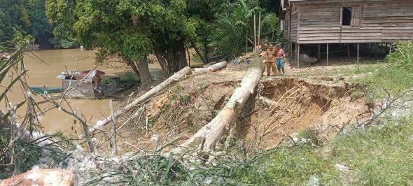 KUTAI BARAT – Curah hujan tinggi pada Sabtu malam (24/1/2026) menyebabkan longsor di beberapa titik di bantaran Sungai Kedang Pahu, anak Sungai Mahakam. Salah satu rumah warga di Kampung Mendika bahkan sudah mencapai tiang rumah yang longsor.