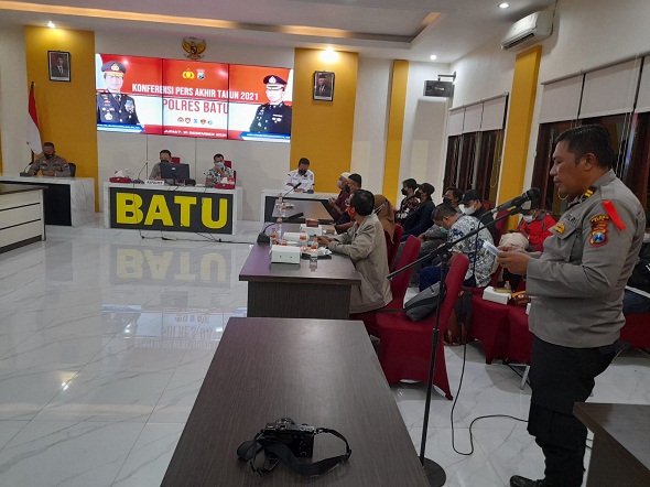 “Tahun 2021 terdapat 247 laporan prosentasenya diungkap 79,76%, mengalami penurunan 14,53% jumlah laporan dan mengalami peningkatan 15,20% penyelesaian,” kata Kapolres Batu dalam Press Release Akhir Tahun 2021 di Ruang Rupatama Mapolres Batu, Jum’at petang  (31/12/2021).