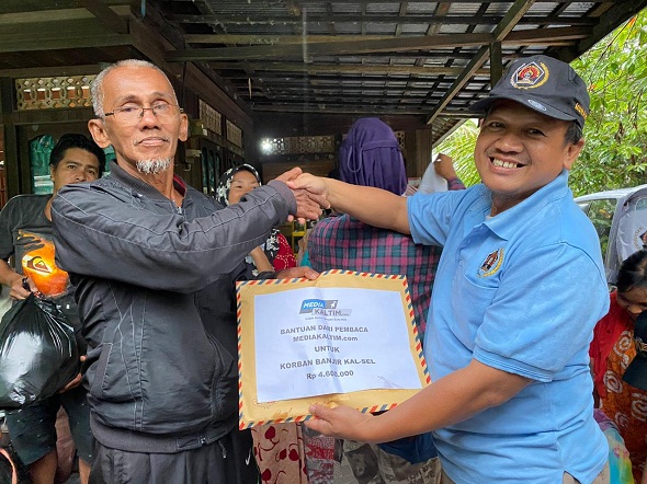Penyerahan bantuan dari Pembaca Media Kaltim diserahkan Munanto Tim Relawan PWI Kaltim kepada Jan Jani Tokoh masyarakat Mahang Baru yang akan melanjutkan pembagian kepada korban banjir bandang.