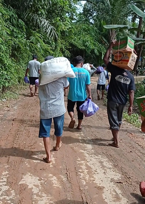 Bantuan sembakopun harus dipanggul, karena jalanan tidak bisa dilalui kendaraan roda empat.