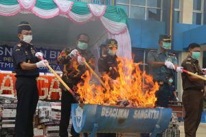 Wakil Bupati H Kasmidi Bulang bersama Kepala KPPBC Sangatta, Hari Murdianto, Kepala Kantor Wilayah Direktorat Jenderal Bea dan Cukai Kalimantan bagian Timur, Rusman Hadi, Kepala Inspektur V Inspektorat Jenderal Kementerian Keuangan, Raden Petrik Wahyu Dwi Saksono, Dandim 0909/Sangatta Letkol Inf Kamil Bahren Pasha, Danlanal Sangatta Letkol Laut (P) Binsar Alfert S Sitorus serta perwakilan pimpinan Foru, Kordinasi Pimpinan Daerah (FKPD) lainnya lakukan pemusnahan tembakau illegal. (Foto: Wak Hedir)