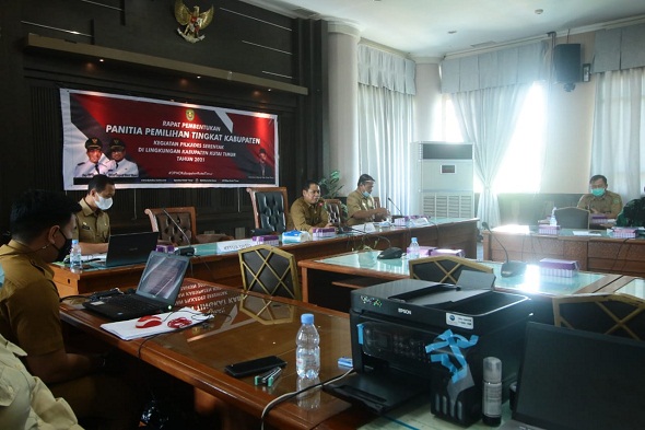 Dinas Pemberdayaan Masyarakat dan Desa (Pemdes) Kutim mulai menggelar rapat pembentukan panitia Pilkades sekaligus sosialisasi regulasi Pilkades 2021. Rapat yang dipimpin Asisten Pemerintahan Umum dan Kesejahteraan Rakyat (Pemksera) Sekretariat Pemkab Kutim, H Suko Buono ini digelar di Ruang Damar, Gedung Serba Guna (GSG), Bukit Pelangi, Selasa (30/3/2021). Melibatkan Ketua DPRD Kutim H Joni, Forum Koordinasi Pimpinan Daerah (FKPD), Kepala Organisasi Perangkat Dearah (OPD) dan jajaran Dinas Pemdes.