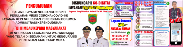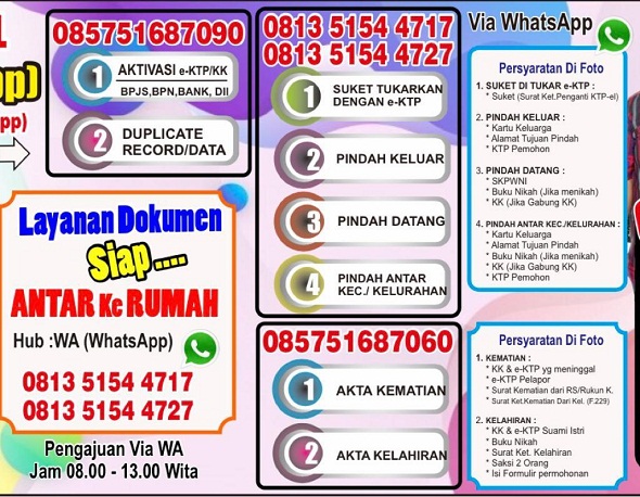 No 085751687060 untuk layanan akta kematian dan akta kelahiran. Kemudian layanan dokumen siap antar ke rumah bisa menghubungi no WA 081351544717 dan 081351544727.