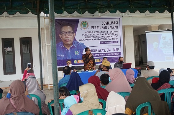 “Perda Kaltim Nomor 1 Tahun 2018 tentang Perlindungan dan Pemenuhan Hak Penyandang Disabilitas, pada pasal 13 mewajibkan pihak pemerintah daerah untuk mempekerjakan sedikitnya 2 persen dan untuk perusahaan swasta paling sedikit 1 persen penyandang disabilitas dari jumlah pegawi atau karyawannya,” tegas H. Agus Aras SM, MAP, anggota komisi III DPRD Kaltim, saat menggelar sosialisasi Perda Kaltim Nomor 1 Tahun 2018 tentang Perlindungan dan Pemenuhan Hak Penyandang Disabilitas kepada ratusan warga Jalan APT Pranoto, Desa Sangatta Utara, Sangatta Kabupaten Kutai Timur, Sabtu (5/3/2022).