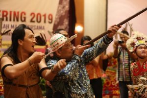 H Ismunandar secara simbolis mempraktikan menyumpit dihadapan ratusan pimpinan perusahaan perkebunan dan pertambangan.(Foto: Fuji)