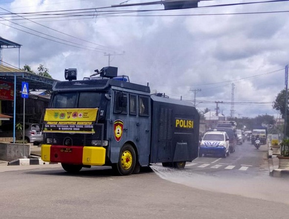 Menggunakan 2 unit mobil AWC Polres Berau dan 1 unit mobil damkar tim melakukan penyemprotan dengan berkeliling kota. Tak hanya itu, beberapa orang juga melakukan penyemprotan secara manual diarea-area yang tak terjangkau oleh mobil., Selasa (31/3/2020
