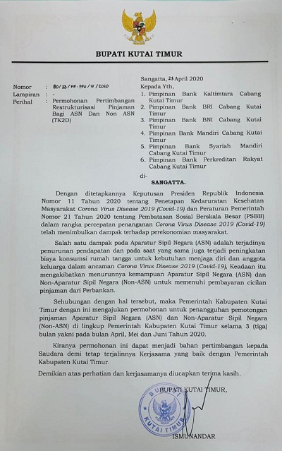 SANGATTA-Bupati Kutai Timur (Kutim) Ismunandar mengeluarkan surat permohonan bernomor 180/33/HK.PPU/IV/2020 yang ditujukan untuk 6 pimpinan Bank seperti Bank Kaltimtara, BRI, BNI, Mandiri, Mandiri Syariah, dan Bank Perkreditan Rakyat (BPR) terkait permohonan pertimbangan restrukturisasi pinjaman bagi ASN dan Non ASN (TK2D), Kamis(23/4/2020).