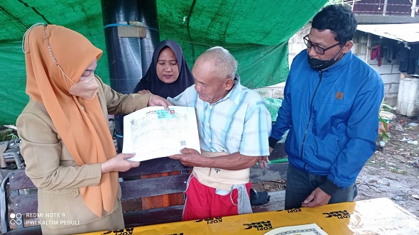 Penyerahan e-KTP diserahkan Sri Hardani dari Dinas Dukcapil Kota Samarinda langsung diterima Mbah Rusmin didampingi keluarga barunya Madrozi dan Marsiati, sedangkan penyerahan