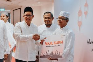 Direktur Keuangan Telkomsel Heri Supriadi secara simbolis menyerahkan kurma untuk berbagi ta’jil Ramadan kepada imam masjid agung dari berbagai wilayah di Indonesia.
