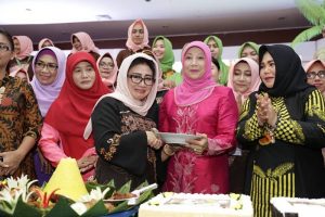 USIA BERTAMBAH: Ketua TP PKK Kutim Bunda Encek UR Firgasih mendapatkan ucapan selamat ulang tahun dari TP PKK dan organisasi wanita lainnya di welcome party HKG ke-47. (Foto: Irfan)