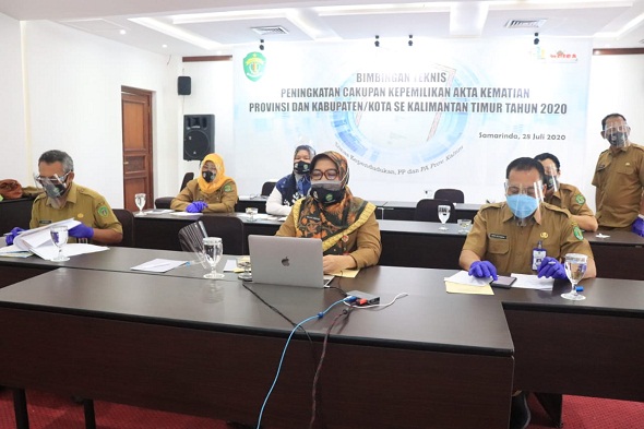Samarinda – Tetap patuhi protokol kesehatan Dinas Kependudukan, Pemberdayaan Perempuan dan Perlindungan Anak (DKP3A) Kaltim melaksanakan Bimtek Peningkatan Cakupan Kepemilikan Akta Kematian Provinsi dan Kabupaten/Kota Se Kaltim, secara virtual atau melalui Zoom Meeting, Selasa (28/7/2020).