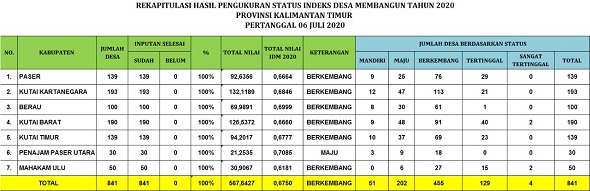 Jika dibandingkan dengan tahun 2019, laju kenaikan status desa sesuai katagori mandiri dan maju cukup pesat. Begitu juga penurunan status desa tertinggal dan sangat tertinggal juga cukup besar. Pada tahun 2019, jumlah desa mandiri di Kaltim hanya 11 desa. Tahun ini mengalami kenaikan menjadi 51 atau naik sebesar 363,63 persen.