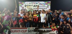 SENDAWAR – Kesebelasan Kecamatan Bongan berhasil meraih juara sepakbola Bupati Cup setelah pada partai final mengalahkan Kecamatan Barong Tongkok 2-1 di Stadion Swalas Guna Barong Tongkok Kutai Barat, Selasa (2/7/2019).