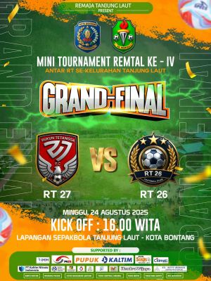 BONTANG – Laga final  Mini Turnamen antar RT se Kelurahan Tanjung Laut bakal tersaji di Lapangan Tanjung Laut, sore ini pukul 16.00 Wita, Minggu (24/8/2025). Dua RT, 27 dan 26 bakal adu kemampuan untuk menjadi yang terbaik. RT 27 melaju ke final dengan catatan tak terkalahkan.