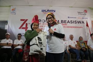 Direktur Utama Telkomsel Emma Sri Martini saat memberikan souvenir kepada salah satu masyarakat di Tarakan (16/8). Komitmen ini dilakukan Telkomsel dalam membangun infrastruktur jaringan yang merata di negara Indonesia, termasuk seluruh wilayah di pulau Kalimantan