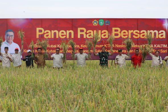 TENGGARONG – Bupati Kabupaten Kutai Kartanegara (Kukar) dr. Aulia Rahman Basri melakukan panen raya bersama di areal Persawahan program kerja sama Pemerintah Kabupaten Kukar bersama Kodim 0906/KKR di Desa Sumber Sari, Kecamatan Loa Kulu, Senin (25/8/2025).