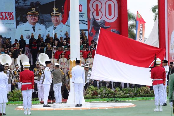 TENGGARONG – Ditengah cuaca mendung dan hujan rintik – rintik pelaksanaan upacara pengibaran Bendera Merah Putih dalam rangka memperingati Proklamasi Kemerdekaan Republik Indonesia ke 80 tahun 2025 di halaman Kantor Bupati Kutai Kartanegara (Kukar), Minggu (17/8/2025) berjalan lancar dan khidmat.