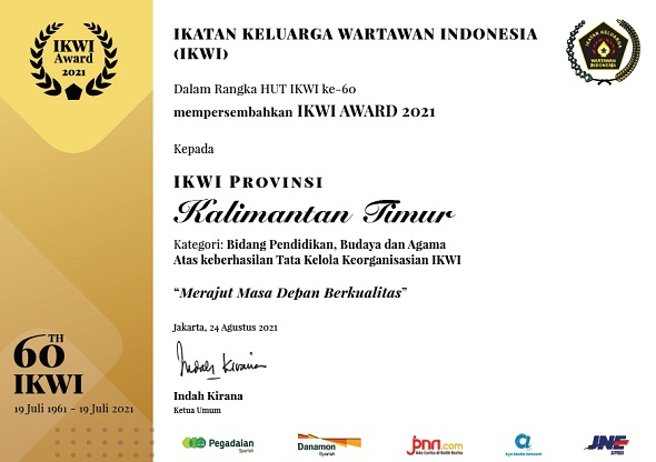 SAMARINDA – Ikatan Keluarga Wartawan Indonesia (IKWI) Kalimantan Timur menerima IKWI Award Kategori Bidang Pendidikan, Budaya dan Agama yang diberikan Pengurus IKWI Pusat pada peringatan HUT ke-60 IKWI yang dilaksanakan secara virtual, Selasa (24/8/2021)