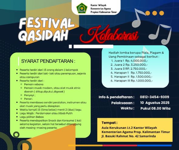 SAMARINDA — Kantor Wilayah Kementerian Agama (Kanwil Kemenag) Provinsi Kaltim siap menggeber Festival Qasidah Kolaborasi tahun 2025. Kegiatan Festival Seni Budaya Islam ini rencananya dilaksanakan pada tanggal 10 Agustus 2025, di Aula Kerukunan Lt 2 Kanwil Kementerian Agama Provins Kaltim, di Jalan. Basuki Rahmat No 42 Samarinda.