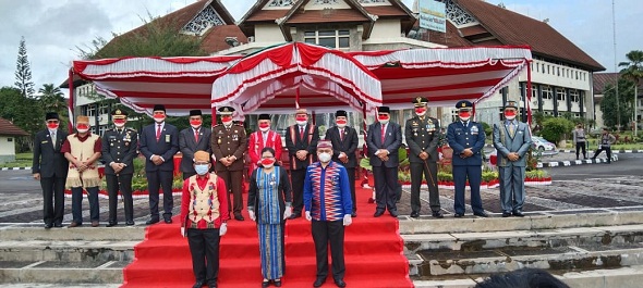 SENDAWAR – Peringatan hari kemerdekaan ke 76 Republik Indonesia tahun 2021 di halaman Kantor Bupati Kutai Barat (Kubar) diikuti Forkompimda dan beberapa anggota Kodim, Polres dan Satpol PP berjalan lancar dan khidmat.