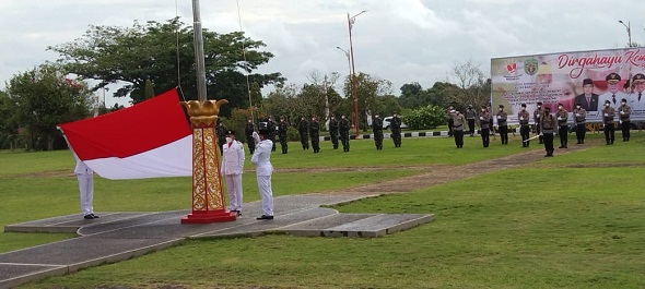 Pelaksanaan upacara tetap mengacu dengan protokol kesehatan, tanpa memberikan sambutan serta bendera merah putih dikibarkan tiga orang Paskibraka.