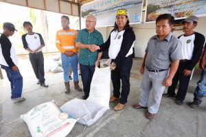 SIMBOLIS: Seskab Irawansyah menyerahkan secara langsung pupuk kompos, pupuk sp 36, pupuk urea, alat kompor gas, mixer, dan blender kepada peserta sekolah lapang tambak dan pengelolaan UMKM kelas kuliner. (Foto: Irfan)