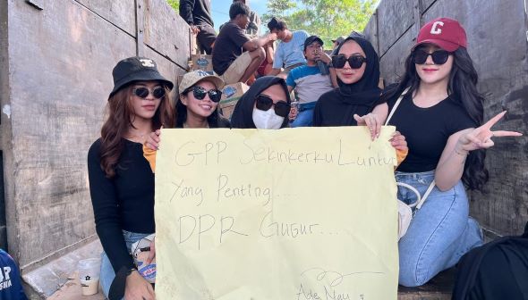 Tak hanya itu, Ade Nay juga membawa sebuah poster unik yang ia tulis bersama rekannya. Poster tersebut bertuliskan, “GPP Skinkerku Luntur, yang Penting DPR Gugur.” Kalimat sindiran bernuansa ringan tersebut sontak menjadi perhatian banyak orang. Beberapa peserta aksi bahkan sempat mendokumentasikan momen itu dan menyebarkannya di media sosial.