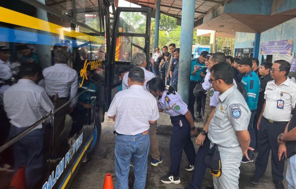 SAMARINDA – PT Jasa Raharja Cabang Samarinda bersama Dinas Perhubungan Kota Samarinda mengadakan pemeriksaan kelayakan kendaraan (ramp check) untuk angkutan umum di Terminal Sungai Kunjang Samarinda, Kamis (18/09/20250.