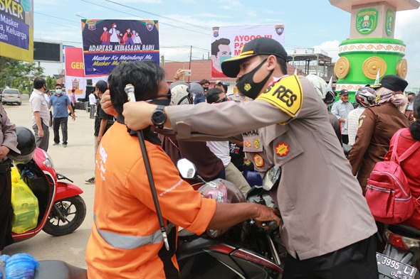 “Mulai hari ini, tidak ada lagi masyarakat yang tidak menggunakan masker saat berada di luar rumah. Baik pengguna jalan maupun mereka yang bekerja di toko dan warung. Semua harus menggunakan masker. Jauh dekat, asalkan berada di luar rumah, wajib menggunakan masker,” tegas Indras.