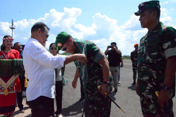 SENDAWAR – Wakil Bupati Kutai Barat (Kubar), H. Nanang Adriani, menyambut kedatangan Komandan Pusat Teritorial Angkatan Darat (Danpusterad) Letjen TNI Mochamad Syafei Kasno beserta rombongan dengan prosesi adat khas Kutai Barat, di Bandara Melalan, Sendawar, Rabu (15/10/2025).
