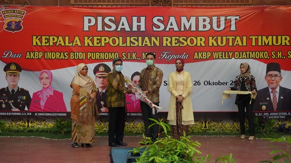 Sangatta – Pjs Bupati Kutai Timur (Kutim)Muhammad Jauhar Efendi didampingi isteri Ny Rina Marlina Jauhar menghadiri pisah sambut Kapolres Kutim. Kegiatan dihelat di ruang Meranti, Kantor Bupati, Senin (26/10/2020) digelar sederhana dan tetap memperhatikan protokol kesehatan.