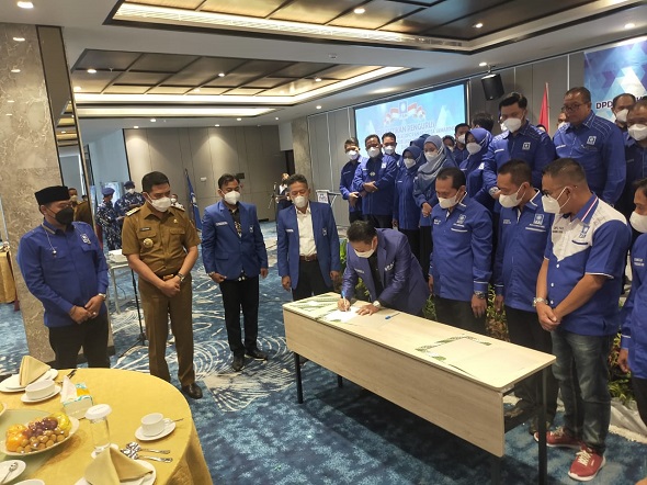 SAMARINDA – Ketua Dewan Pimpinan Wilayah (DPW) PAN Kaltim Sigit Wibowo melantik –  Pengurus Dewan Pimpinan Daerah (DPD) dan Dewan Pimpinan Cabang (DPC) Partai Amanat Nasional (PAN) se-Kota Samarinda periode 2020-2025di Hotel Mercure, Selasa (12/10/2021). Pelantikan ditandai penyerahan pataka oleh Sigit Wibowo kepada Ketua DPD PAN Samarinda, Jasno.