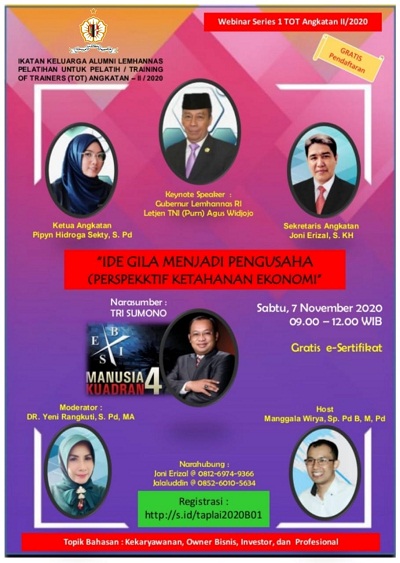 JAKARTA – Menghadapi pandemi Covid-19, mendorong Alumni Training of Trainer (TOT) Pemantapan Nilai-nilai Kebangsaan Angkatan II/2020 Lembaga Ketahanan Nasional (Lemhannas) RI menggelar Webinar Ide Gila Menjadi Pengusaha (Perspektif Ketahanan Ekonomi), Sabtu (7/11/2020). Event ini menggandeng Ikatan Keluarga Alumni Lemhannas (IKAL) Komisariat Provinsi (Komprov) Aceh.
