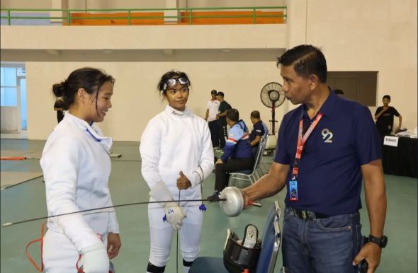 Pelatih anggar saat memberikan arahan pada Atlet Anggar putri