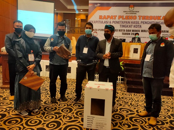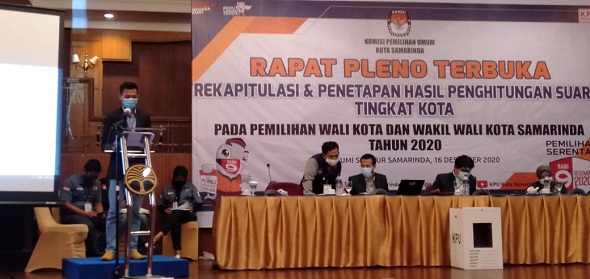 SAMARINDA – KPU Samarinda menggelar rapat pleno terbuka rekapitulasi dan penetapan hasil penghitungan suara tingkat kota pada Pilkada Samarinda 2020. Pleno dihadiri komisioner KPU Samarinda dan Bawaslu serta seluruh Panitia Pemilihan Kecamatan (PPK) se-Samarinda ini berlangsung di Ballroom Hotel Senyiur Samarinda dan dimulai sekitar pukul 10.00 Wita, Rabu 16/12/2020),