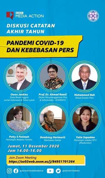 Hal tersebut terungkap saat webinar yang diselenggarakan BBC media dan Dewan Pers, Jumat 11 Desember 2020 dengan tema “Pandemi Covid-19 dan Kebebasan Pers”. Dengan nara sumber, Ketua Dewan Pers RI- M. Nuh, Duta Besar Inggris untuk Indonesia dan Timor Leste-Owen Jenkins, Staf Ahli Kemenkominfo RI-Prof Hendry Subiakto, wartawan senior-Bambang Harymurti, Pimpinan Redaksi Femina-Petty S Fatimah dan diikuti ratusan wartawan seluruh Indonesia dan di pandu oleh Yulia Supadmo-Pimpinan Redaksi RTV sebagai moderator.
