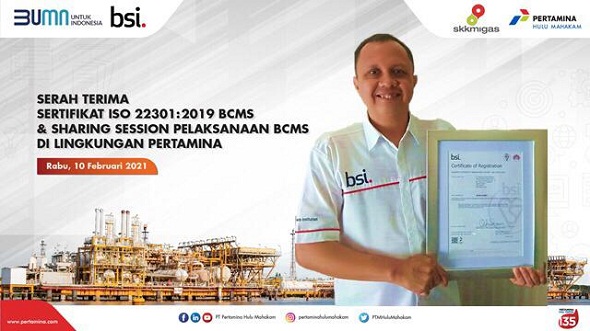 JAKARTA – PT Pertamina Hulu Mahakam (PHM) selaku operator Wilayah Kerja (WK) Mahakam, dengan dukungan SKK Migas dan PT Pertamina Hulu Indonesia (PHI) selaku induk perusahaan, mengumumkan bahwa perusahaan menerima sertifikasi ISO 22301:2019 Sistem Manajemen Keberlanjutan Bisnis (Business Continuity Management System/BCMS) dari PT British Standard Institution (BSI) Group Indonesia.