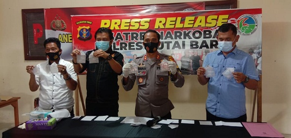“Kita mengamankan narkoba jenis sabu – sabu total sebanyak 42 poket seberat 18,8 gram dari para tersangka,”kata AKBP Kapolres Irwan Y.P didampingi Kasat Narkoba AKP. Simon Tammu, Kasubag Humas Polres, Iptu. Andreas, Kanit Idik Ipda. Mangapul Parlindungan dan PS. Kaurmintu Aipda. Jatmiko  saat menyampaikan konfrensi pers di ruang Satresnarkoba Mapolres Kubar, Selasa (9/2/2021)
