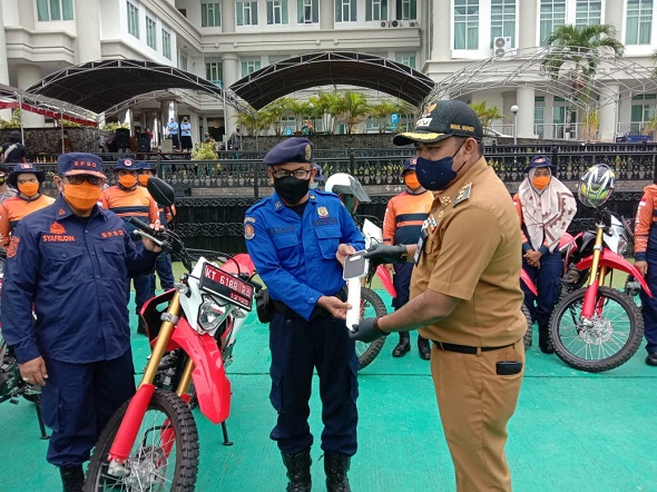 Penyerahan oleh Plt Bupati H Kasmidi Bulang, didampingi Kepala Pelaksana Badan Penanggulangan Bencana Daerah (BPBD) Kutim, Syafruddin, usai pelaksanaan Apel Gabungan Karhutla 2021, Senin (8/2/2021) di Halaman Kantor Bupati, Pusat Perkantoran Pemkab Kutim.