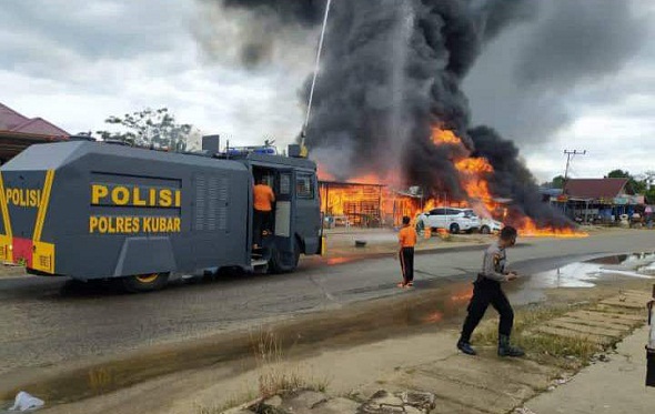 SENDAWAR – Tempat penjualan Bahan Bakar Minyak (BBM) eceran terbakar di jalan A. Yani, Kecamatan Barong Tongkok, Kabupaten Kutai Barat (Kubar), Jumat (17/12/2021). Peristiwa kebakaran dengan kobaran api yang cukup besar sempat membuat warga panik.