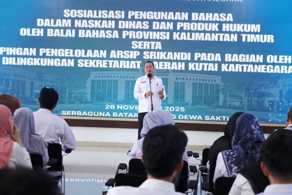 Tenggarong – Plh Sekretaris Daerah (Sekda) Kutai Kartanegara (Kukar) Dafip Haryanto secara resmi membuka kegiatan Sosialisasi Penggunaan Bahasa dalam Naskah Dinas dan Produk Hukum serta Pendampingan Pengelolaan Arsip Srikandi di lingkup Sekretariat Kabupaten Kutai Kartanegara. Kegiatan dilaksanakan di Ruang Serbaguna Kantor Bupati Kukar, Rabu (26/11/2025).