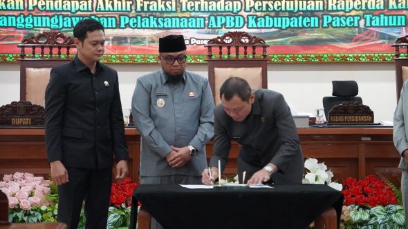 Penandatanganan berlangsung saat Rapat Paripurna DPRD Paser, di Gedung Baling Seloloi, Sekretariat DPRD Paser dan dihadiri Unsur Forum Komunikasi Pimpinan Daerah (Forkompinda) Paser dan instansi vertikal lainnya, Kamis (17/7/2025),.